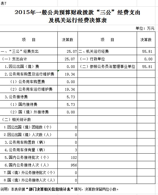 2015年“三公”经费共支出 25.07 万元,其中,因公出(国)境费 0 万元;公务用车购置及运行维护费19.34万元,公务用车保有量 3辆,运行维护费 19.34万元; 公务接待费 5.73 万元,共接待批次 102个,接待人次956 人。“三公”经费与上年比较减少14.2万元,减少了36.16%,主要原因是:公务接待活动减少,费用下降。