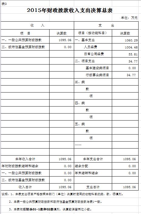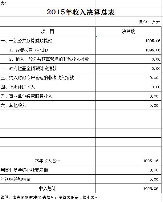 1、收入决算:2015年决算数1095.06万元,其中,一般公共预算财政拨款1095.06万元。